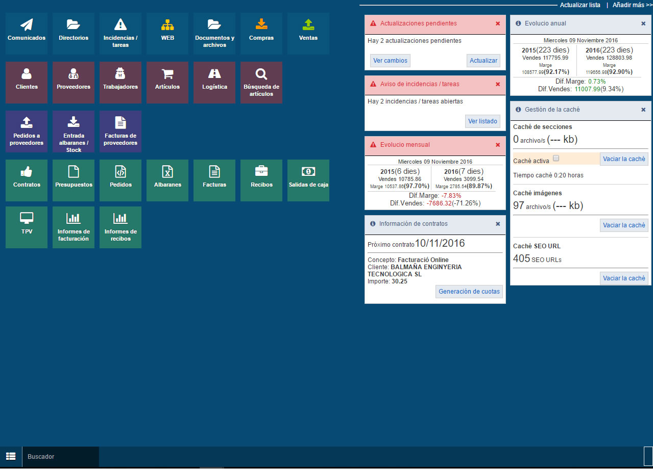- Vendes: pressupostos, contractes, albarans, factures, cartera de rebuts, sortides de caixa, etc.