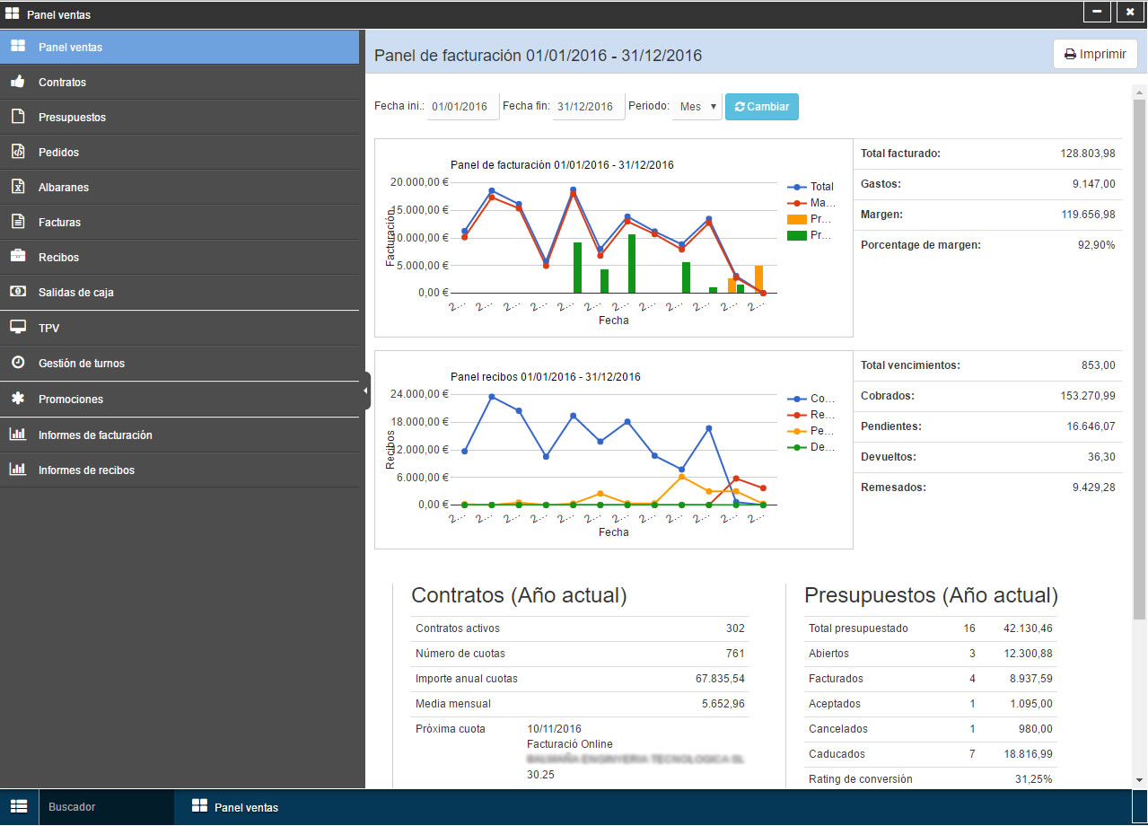 - Llistats: tots els possibles llistats imaginables amb múltiples filtres. Llistats de clients, treballadors, proveïdors, factures, rebuts(inclou la gestió de remeses i el control d’impagats), articles, llistats de control, etc.